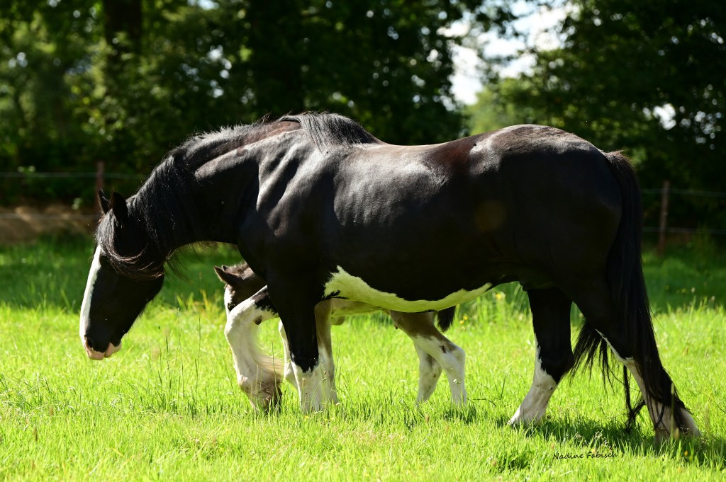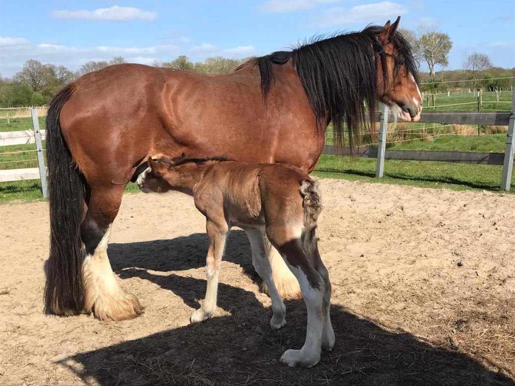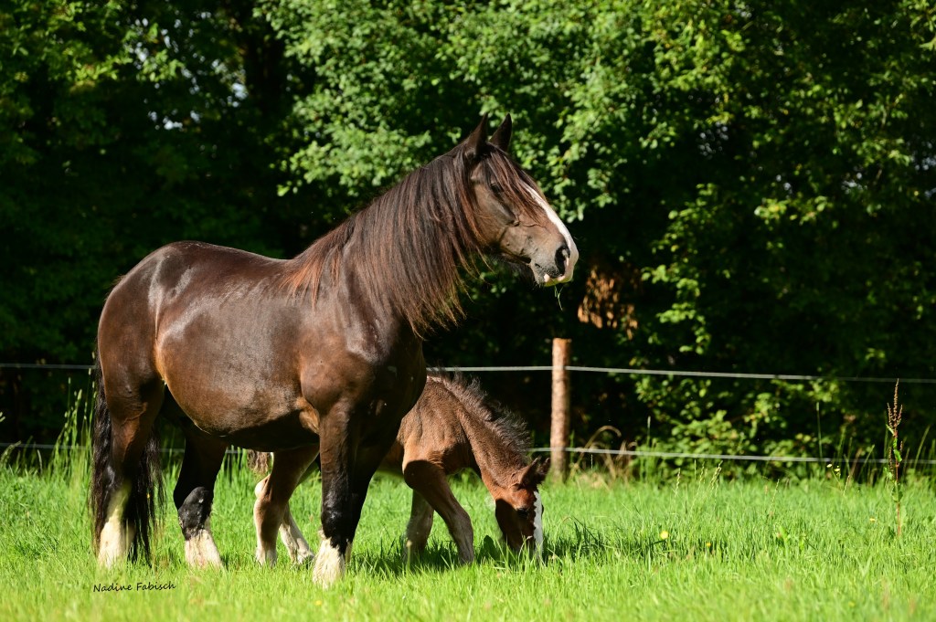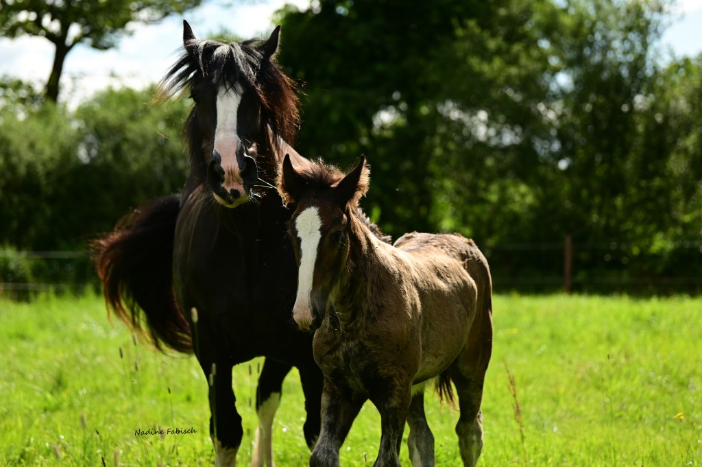 Dawn („Oakridge New Dawn“), von uns wird sie oft „grumpy old girl“ genannt: Scheint immer ein bisschen mürrisch, aber lieb und ehrlich. Ihr Urgroßvater war ein Clydesdale, was bei manchen Fohlen von ihr gut zu sehen ist.